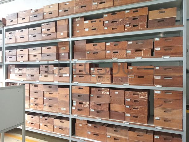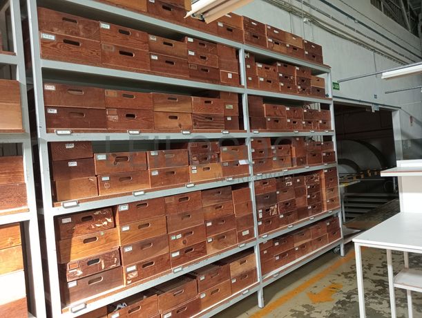 Estante com 2 módulos com cerca de 151 caixas de madeira