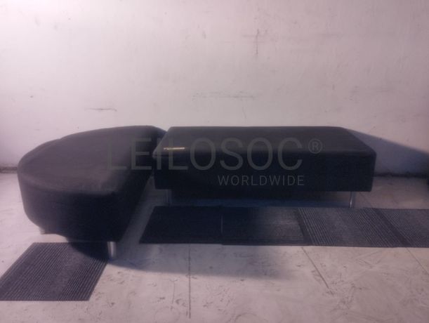 Sete sofás modulares de sala de espera, sendo dois de meia lua e cinco quadrados