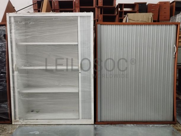 Quarto Armários de portas móveis, sendo um metálico e três de madeiras e quatro módulos de gavetas