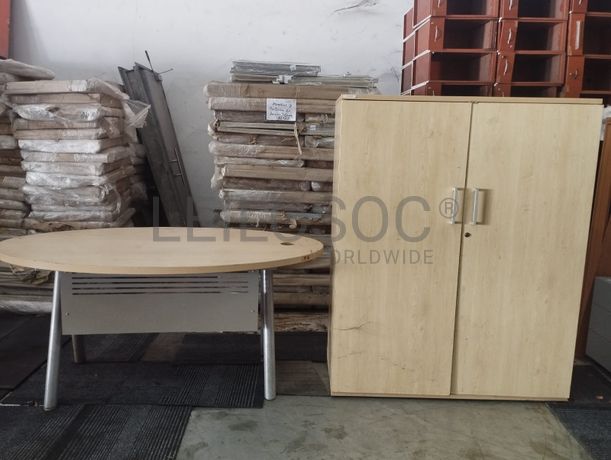 Uma secretária no formato oval e dois armários de madeira