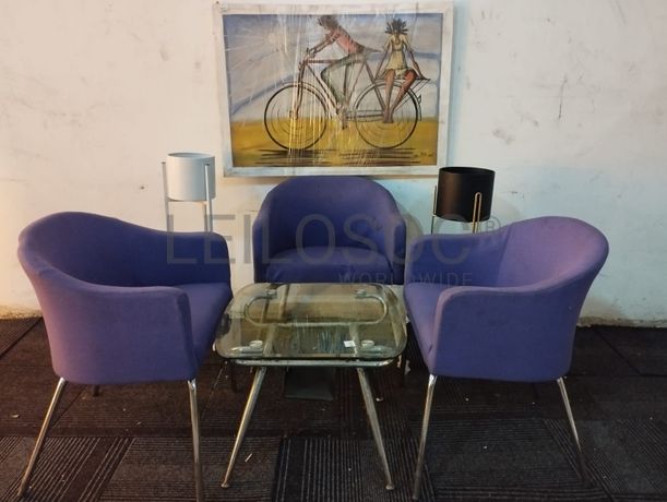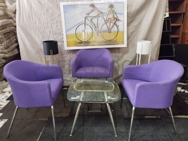 Quatro poltronas, uma mesinha de centro, dois vasos decorativos e dois vasos decorativos
