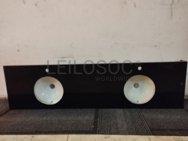 Duas bancadas de casa de banho em granito preto com lavatório de cerâmica embutido.