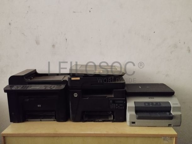 Duas impressoras marcam HP e uma impressora de cadernetad Epson PlQ 22CS, Scâner