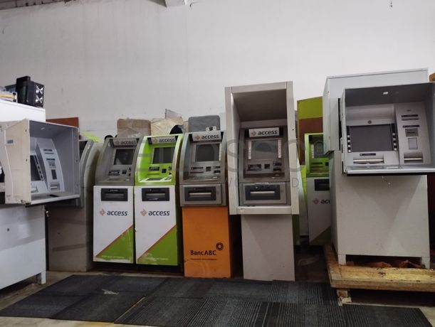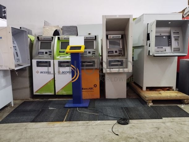 Vinte quatro Caixas automáticas de ATM danificados (quebrados) e onze Totem pedestal para tablet ou ecrãs pequenos