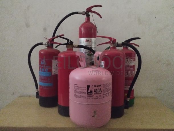 Quinze extintores de incêndio, dois cilindros de fluidos refrigerante R- 410A