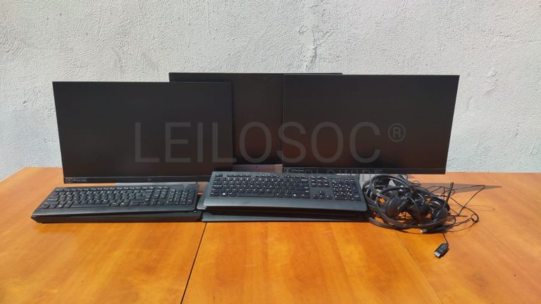 Três monitores marca HP, seis teclados e quatro fones de ouvido
