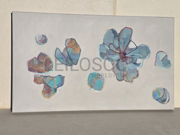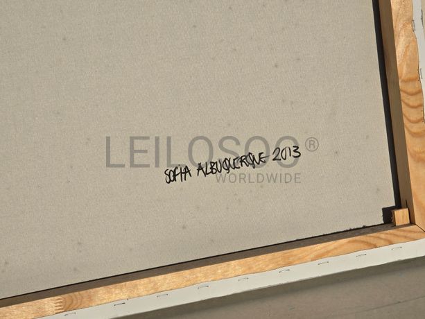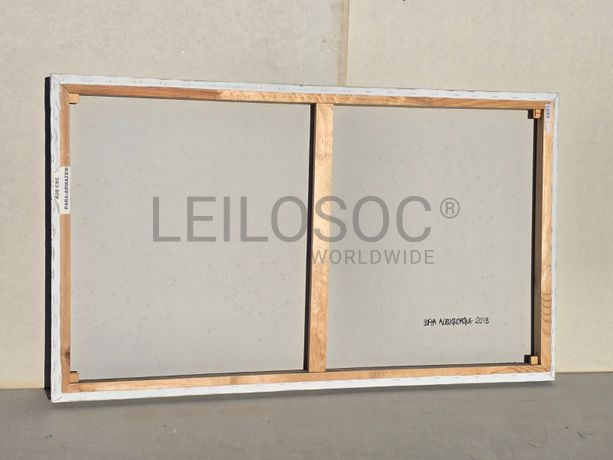Tela pintada à mão, com assinatura de autora, estrutura de madeira, de 120x70 centímetros.