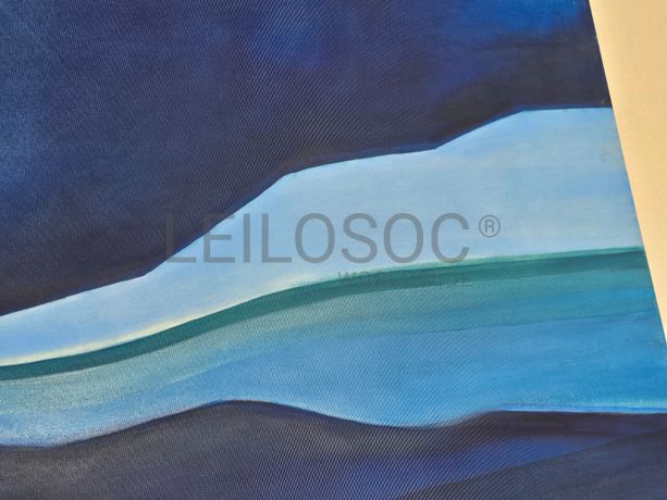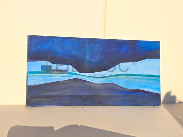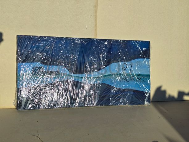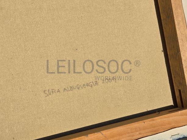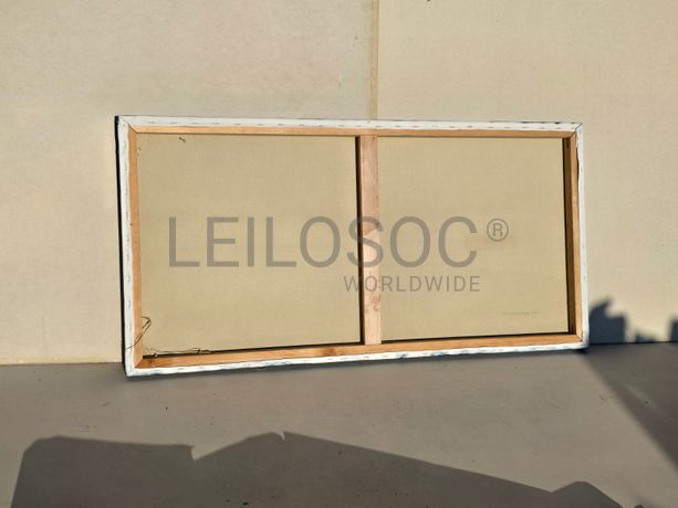 Tela pintada à mão, com assinatura de autora, estrutura de madeira, de 120x60 centímetros.