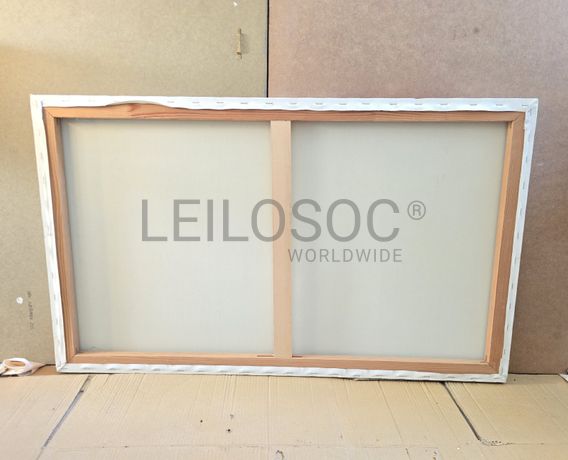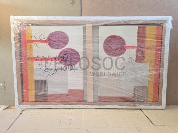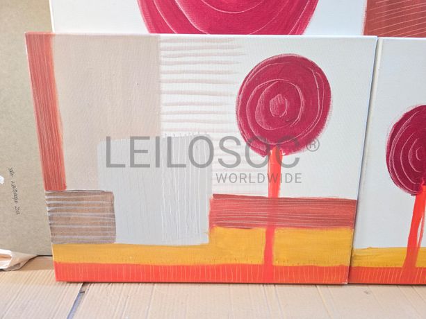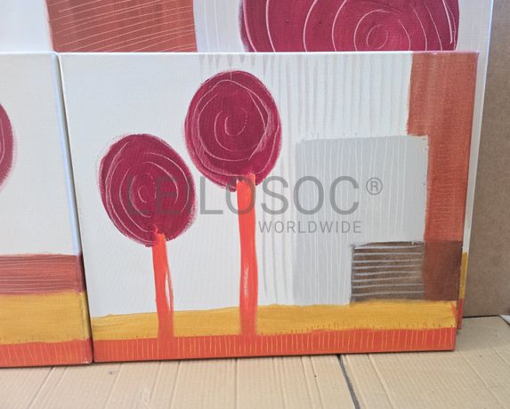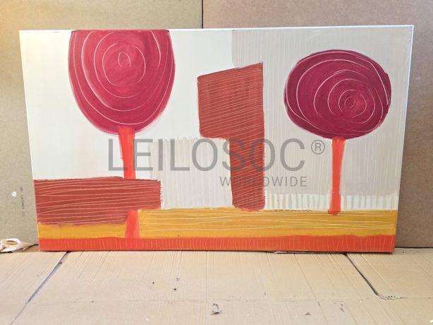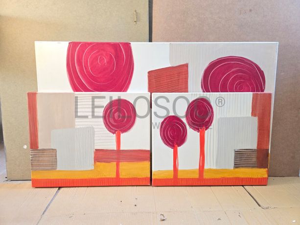 Conjunto de três telas pintadas à mão, com estrutura de madeira, de 100x60 e 50x40 centímetros.