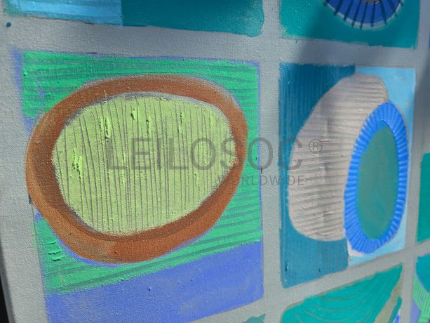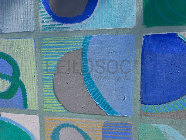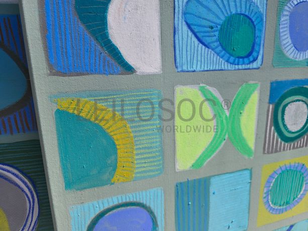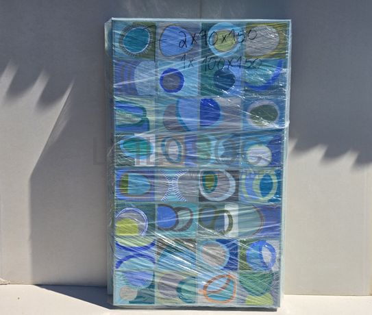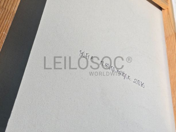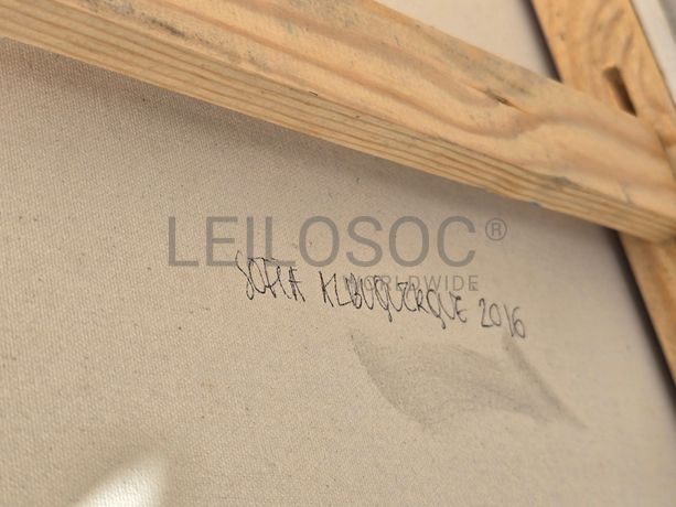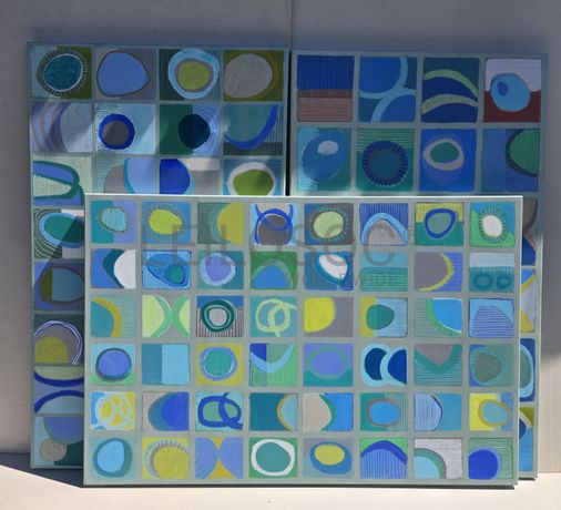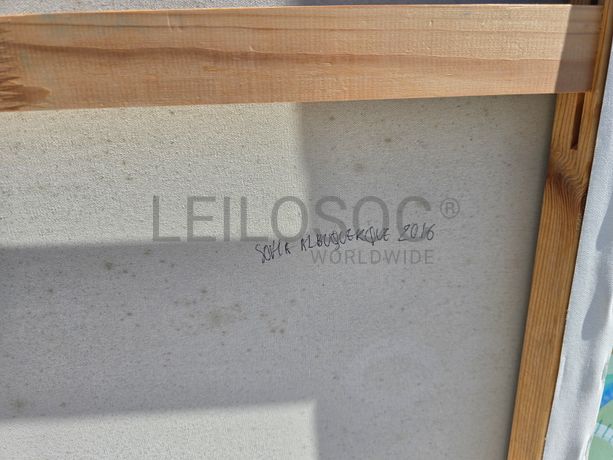 Conjunto de três telas pintadas à mão, com assinatura de autora, estrutura de madeira, de 150x90 e 150x100 centímetros.