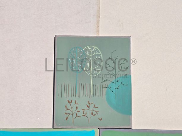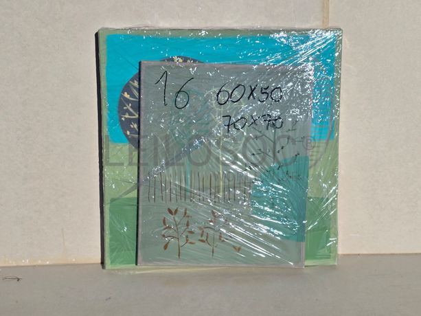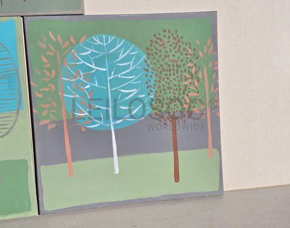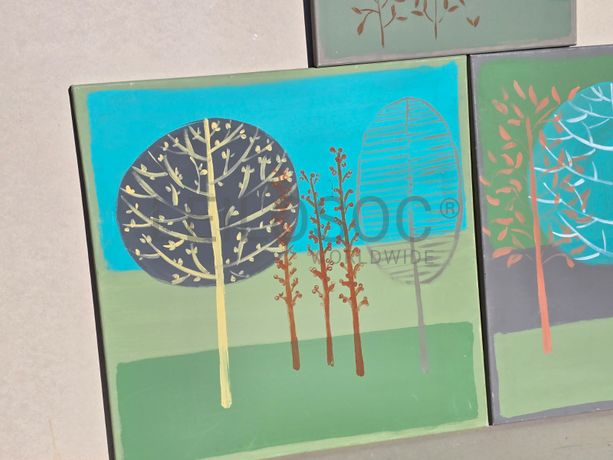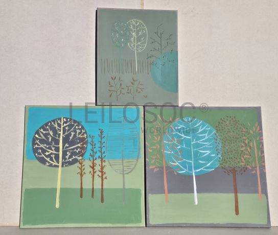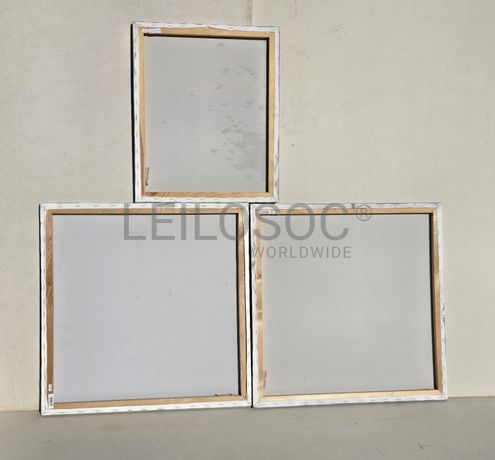 Conjunto de três telas pintadas à mão, com assinatura de autora, estrutura de madeira, de 70x70 e 60x50 centímetros.