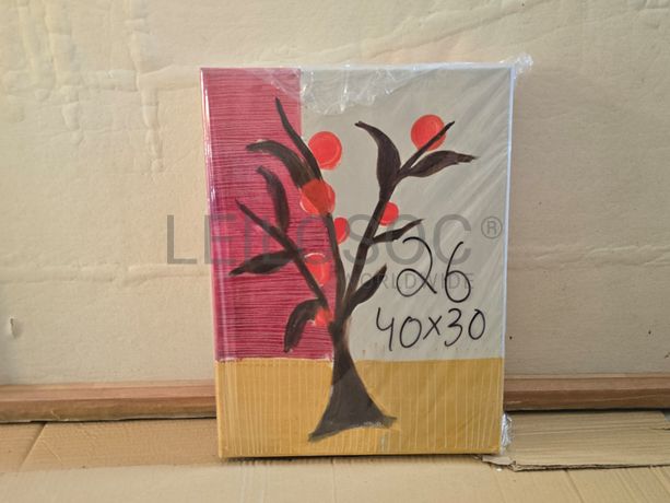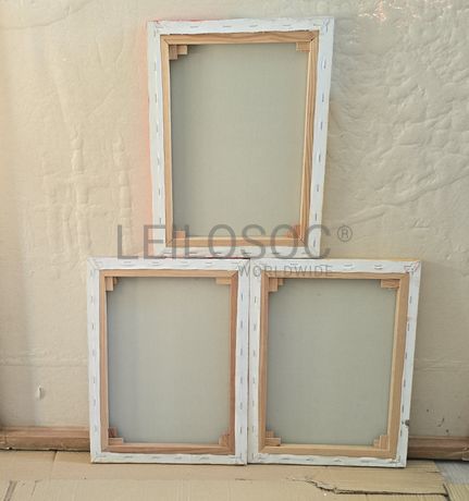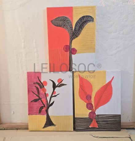 Conjunto de três telas pintadas à mão, com estrutura de madeira, de 40x30 centímetros.