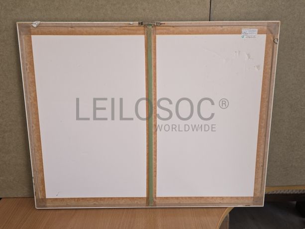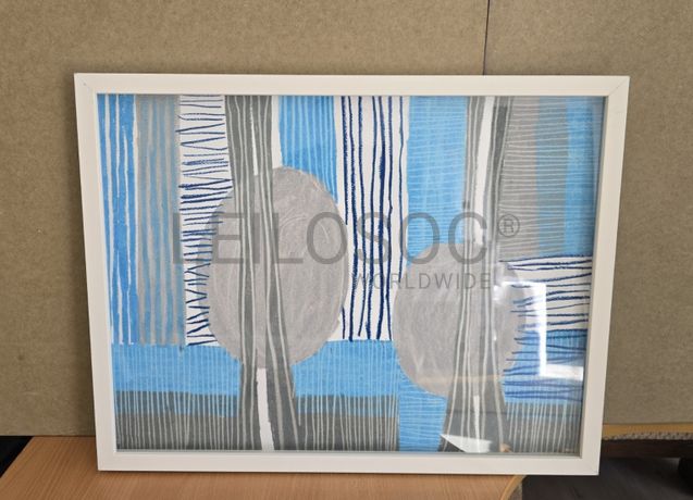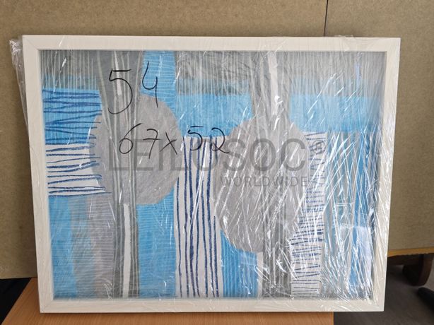 Tela pintada à mão, em moldura branca, com 67x52 centímetros.