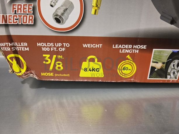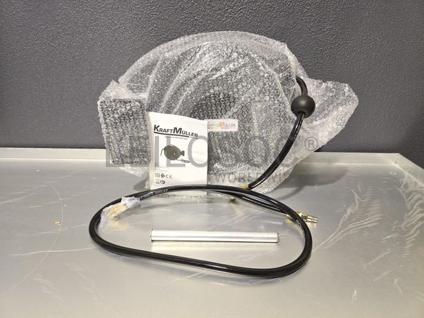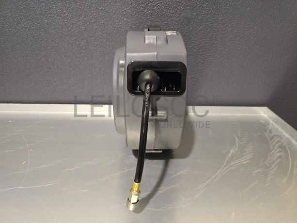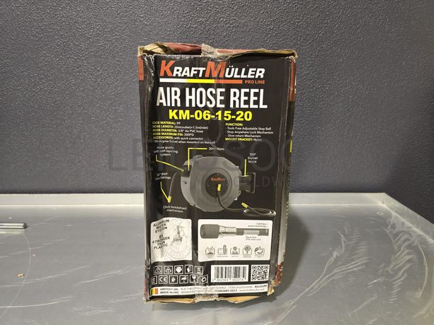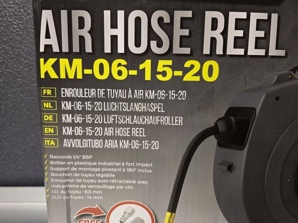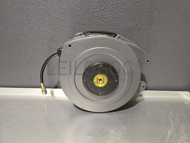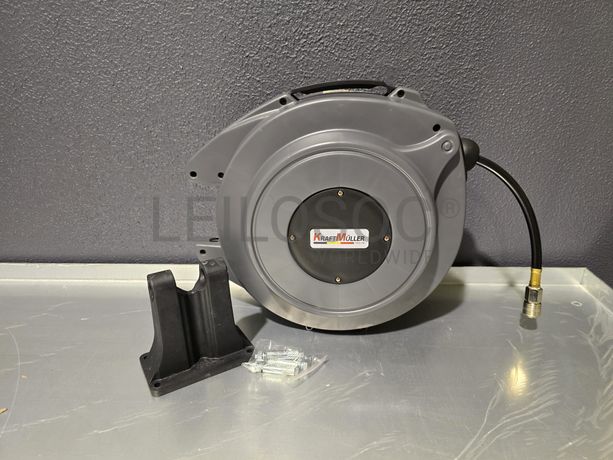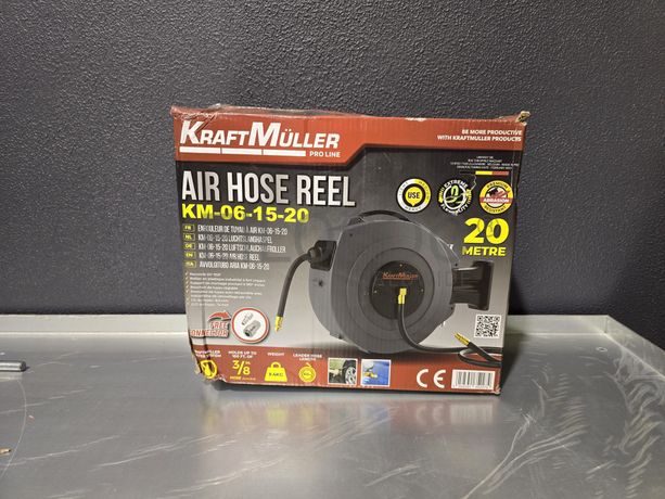 Carretel de mangueira de ar, da marca KraftMuller, com 20 metros, com acessórios e fixação.
