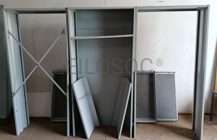 Quatro estruturas modulares de estantes metálicas desmontadas