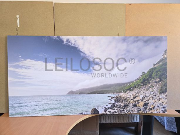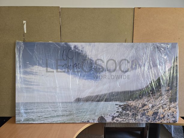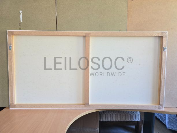 Tela de motivo natureza, de 140cm de comprimento e de 70cm de altura, com estrutura em madeira.