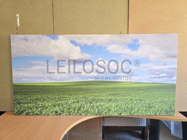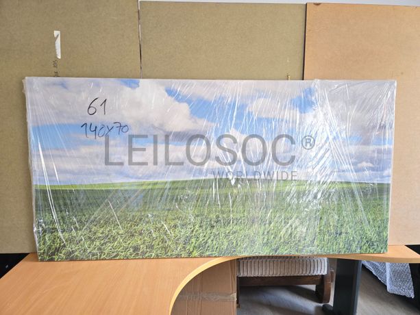Tela de motivo natureza, de 140cm de comprimento e de 70cm de altura, com estrutura em madeira.