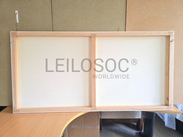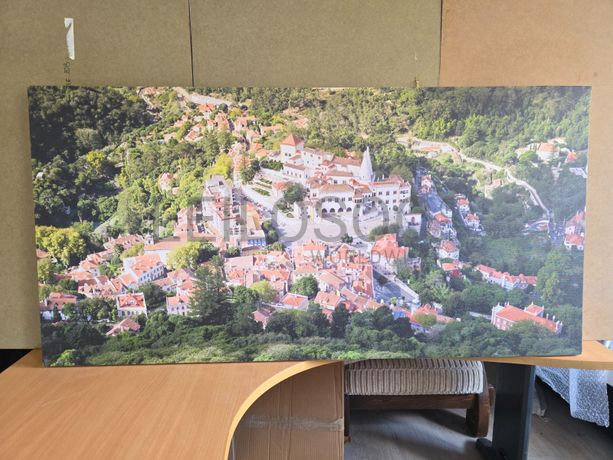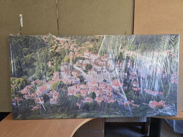 Tela de motivo natureza, de 140cm de comprimento e de 70cm de altura, com estrutura em madeira.