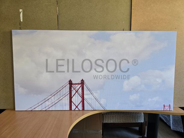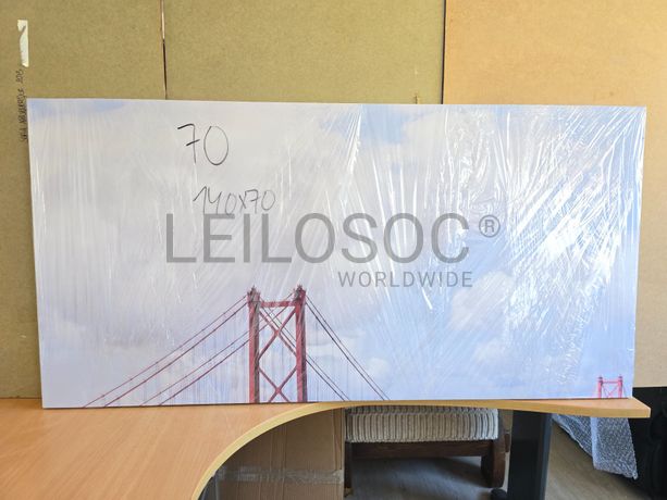 Tela de motivo natureza, de 140cm de comprimento e de 70cm de altura, com estrutura em madeira.