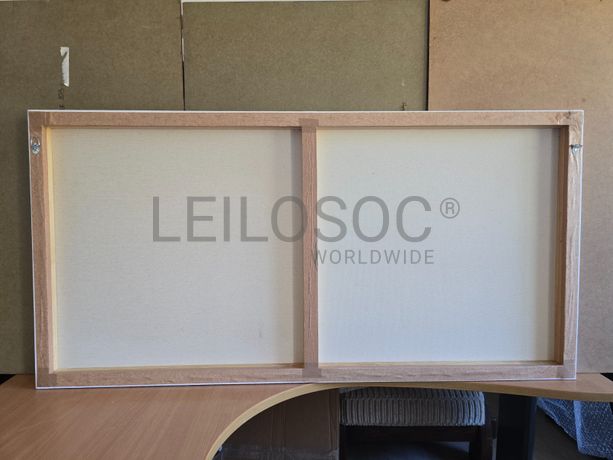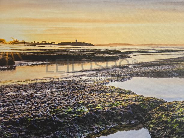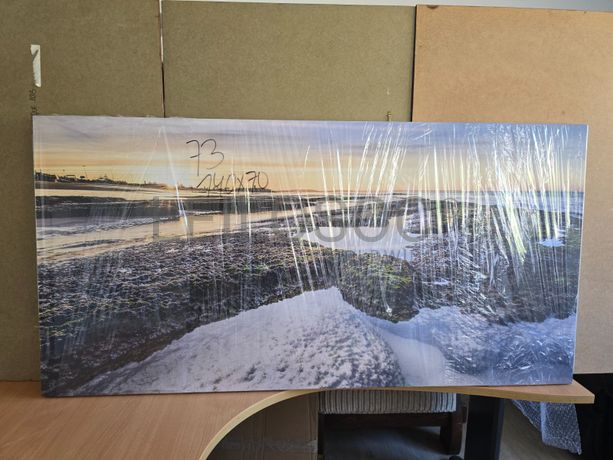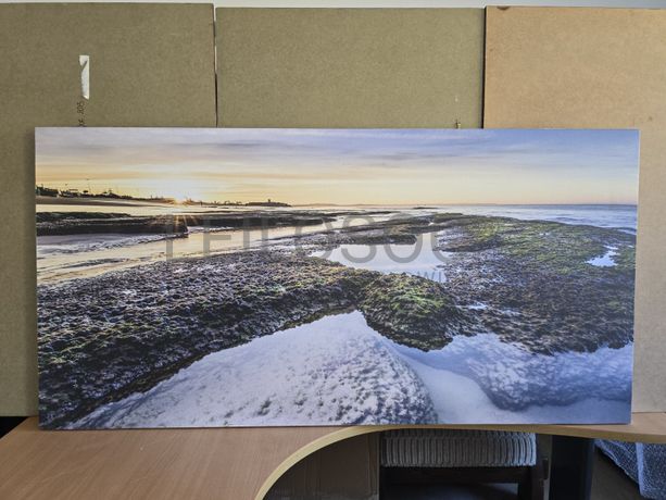 Tela de motivo natureza, de 140cm de comprimento e de 70cm de altura, com estrutura em madeira.