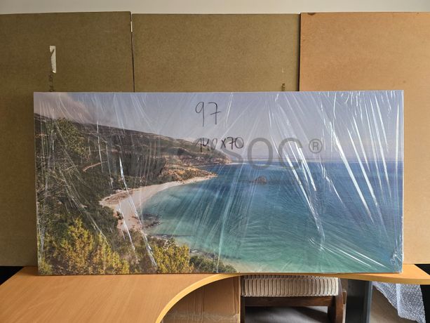 Tela de motivo regional, de 140cm de comprimento e de 70cm de altura, com estrutura em madeira.