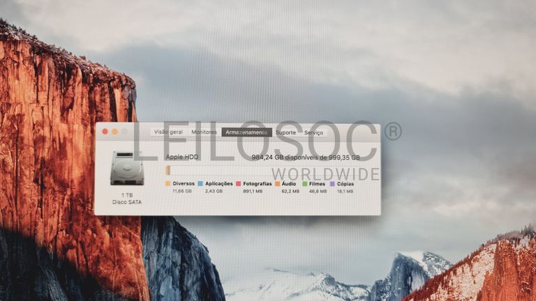 Computador Apple iMac A1418, All In One, com processador Intel Core i5, memória RAM de 8GB, disco HDD de 1TB com sistema, ecrã retina integrado de 21.5" e sistema operativo macOS X El Capitan.