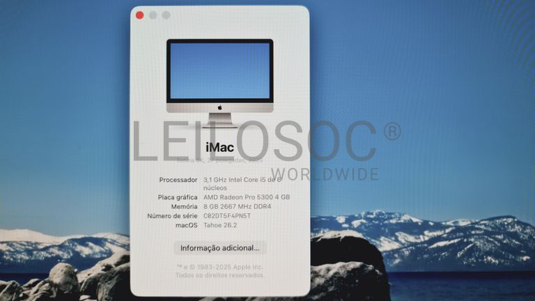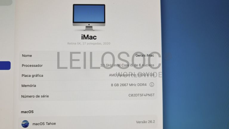 Computador Apple iMac A2115, All In One, com processador Intel Core i5 de 10ª geração, memória RAM de 8GB, disco SSD NVME de 256GBGB com ecrã retina 5K de 27" integrado, placa gráfica AMD Radeon Pro 5300 de 4GB e sistema operativo macOS Tahoe 26.2.